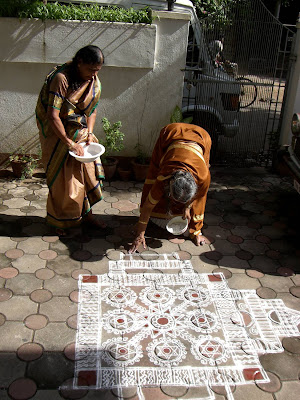 Preethi's aunties drawing an enormous design on the floor with rice flour.